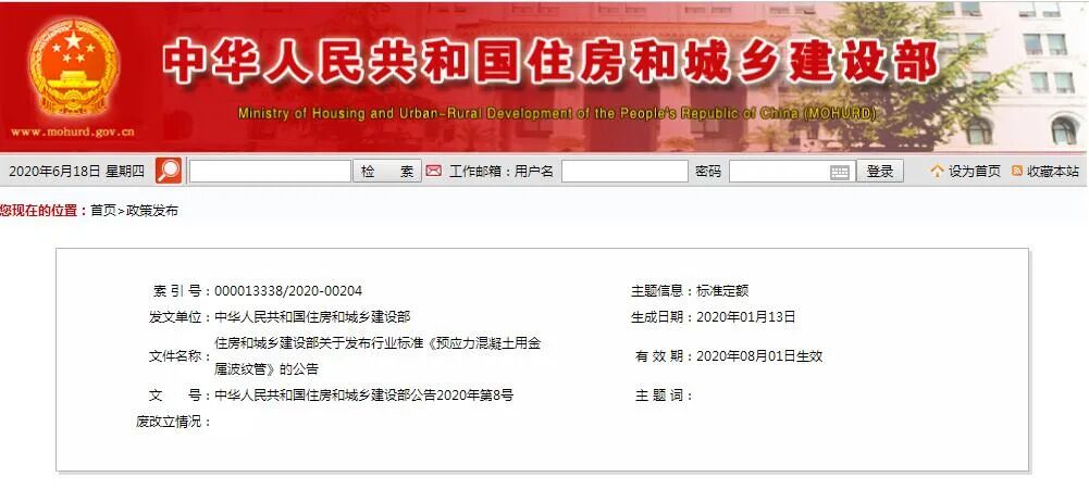住房和城乡建设部关于发布行业标准 《预应力混凝土用金属波纹管》的公告 现批准《预应力混凝土用金属波纹管》为建筑工业行业产品标准,编号为JG/T225-2020,自2020年8月1日起实施。原《预应力混凝土用金属波纹管》(JG/T225-2007)同时废止。 本标准在住房和城乡建设部门户网站(www.mohurd.gov.cn)公开,并由住房和城乡建设部标准定额研究所组织中国质量标准出版传媒有限公司出版发行。 中华人民共和国住房和城乡建设部 2020年1月13日 本标准是对JG/T225-2007《预应力混凝土用金属波纹管》的修订,JG/T225-2020与JG/T225-2007相比,主要技术内容变化如下: 1.取消按波纹数量进行分类; 2.修改了标记方法; 产品标记应由代号、规格及类别组成: 金属波纹管类别,标准型管代号为B,增强型管代号为Z; 金属波纹管规格,圆管以公称内径表示,扁管以公称内长轴X公称内短轴表示,单位为毫米(mm); 金属波纹管代号:JBG。 3.增加了金属波纹管的构造示意图(详见下方阅读原文中4.1.1和4.1.2); 4.修改了金属波纹扁管的规格(详见下方阅读原文中4.4.2); 5.修改了径向刚度,修改为抗局部横向荷载性能和抗均布荷载性能(详见下方阅读原文中4.5); 6.修改了符号的意义(详见下方阅读原文中4.5); 7.增加了连接管的要求; 连接管应与被连接管具有相同的波形,且尺寸大一个规格;连接管的长度应为圆管公称内径或扁管等效公称内径的4倍~5倍,且不应小于300mm。 8.完善了抗外荷载性能试验方法(详见下方阅读原文中5.3); 9.修改了弯曲后抗渗漏性能试验方法(详见下方阅读原文中5.4.2); 10.修改了型式检验组批的规定; 同一截面形状、同一性能要求的金属波纹管应按下列规定分组,并在每组中各选用一种规格的有代表性的产品进行型式检验: a)公称内径小于或等于60mm时,为小规格组; b)公称内径大于60mm小于或等于90mm时,为中规格组; c) 公称内径大于90mm时,为大规格组; d)公称内短轴相同的扁管为一组。 所有型式检验项目抽样数量均为6件。 11.修改了检验结果判定规则; 当全部出厂检验项目均符合要求时,应判定该批产品合格;当检验结果有不合格项目时,应从同一批产品中未经抽样的产品中重新加倍取样对不合格项目复检,复检结果全部合格,应判定该批产品合格,否则应判定该批产品不合格。 当全部型式检验项目均符合要求时,应判定型式检验合格;当检验结果有不合格项目时,对不合格项目应重新加倍取样复检,复检结果全部合格,应判定型式检验合格,否则应判定型式检验不合格。 12.增加了金属波纹管连接的要求; 连接金属波纹管时,两根被连接波纹管的端部应靠紧,接缝应位于连接管中部,并应采用具有防水性能的材料缠绕,保证连接处的密封性。 13.修改了附录A和附录B。 文章来源 中华人民共和国住房和城乡建设部