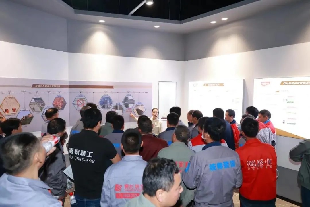 为了让镶贴工们进一步了解粘贴材料的历史、应用及粘贴工艺等,上海爱迪还安排了一场特殊的教学之旅:参观展厅。很多镶贴工们表示,这是他们第一次了解粘结材料的历史,原来自己所处的行业有这么多的文化底蕴,以前只顾低头干活,这一次真是大开眼界了。